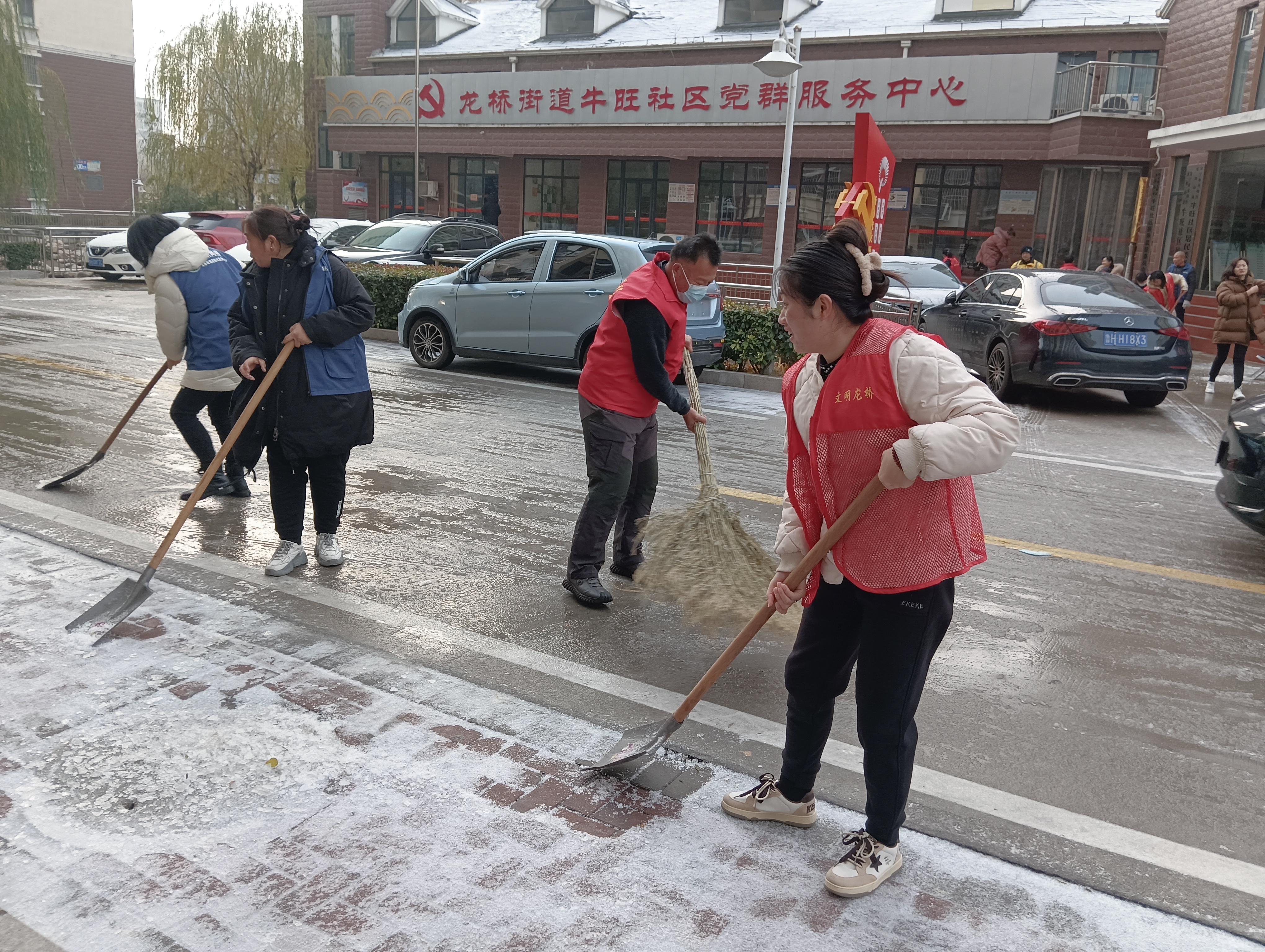 雪天给居民出行带来了极大的不便,飞龙社区老旧小区居多,居民多为老人,清理积雪任务紧迫。为了保障居民出行安全,社区工作人员、网格员、党员群众志愿者们带着扫帚、笤帚、铁锹等铲雪工具自发组织在一起,以“动”制“冻”,努力清除路面的积雪。大家分工有序,配合默契,干劲十足,挥舞着除雪工具,虽然天气寒冷,然而这一切丝毫没有影响大家高涨的扫雪热情。与此同时,为有效对应降雪天气,社区联合物业公司、沿街门店,对小区内部加强巡查,在室外楼梯、坡道、瓷砖地面上铺设防滑草垫,并建议各商户自扫门前雪,方便顾客和行人的出行。