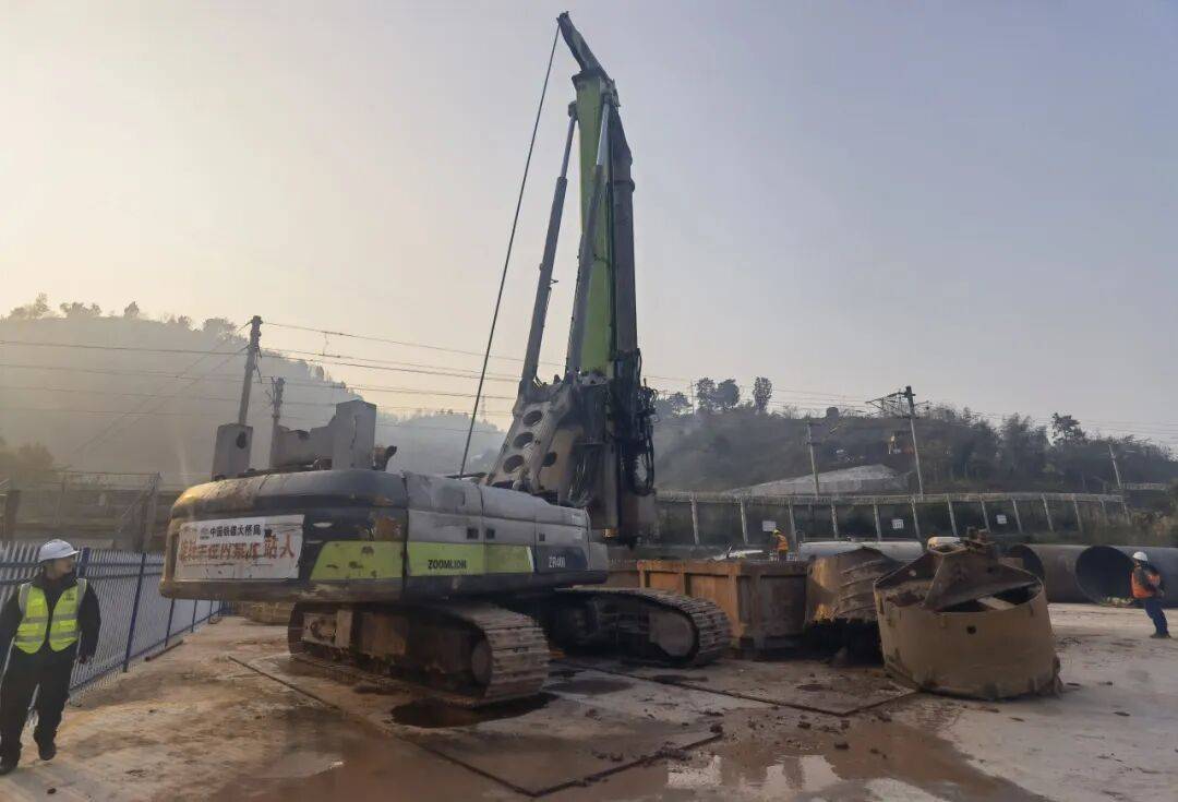 本次施工的3墩单根桩基直径达2米,桩长35米,需浇筑混凝土109.90立方米,且施工区域邻近铁路营业线,对施工安全与周边环境管控提出极高要求。为规避施工对铁路运营的干扰,项目团队精准选用低空旋挖钻成孔工艺,创新引入“双系统”管控模式,通过自动监控系统动态调整施工参数,超声波监测系统排查质量隐患,同步启用24小时不间断全自动观测系统监测铁路线沉降位移,筑牢施工与铁路运营双重安全防线。